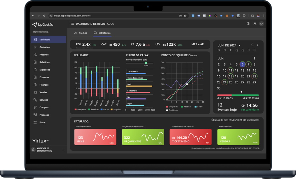Gerencie suas finanças de forma eficiente com um sistema completo para controle de contas a pagar e a receber, conciliação bancária, emissão de notas fiscais (NF-e, NFC-e e NFS-e), gestão de estoque, recorrência e muito mais. Tenha acesso a relatórios avançados e dashboards inteligentes para impulsionar seus resultados com o UpGestão